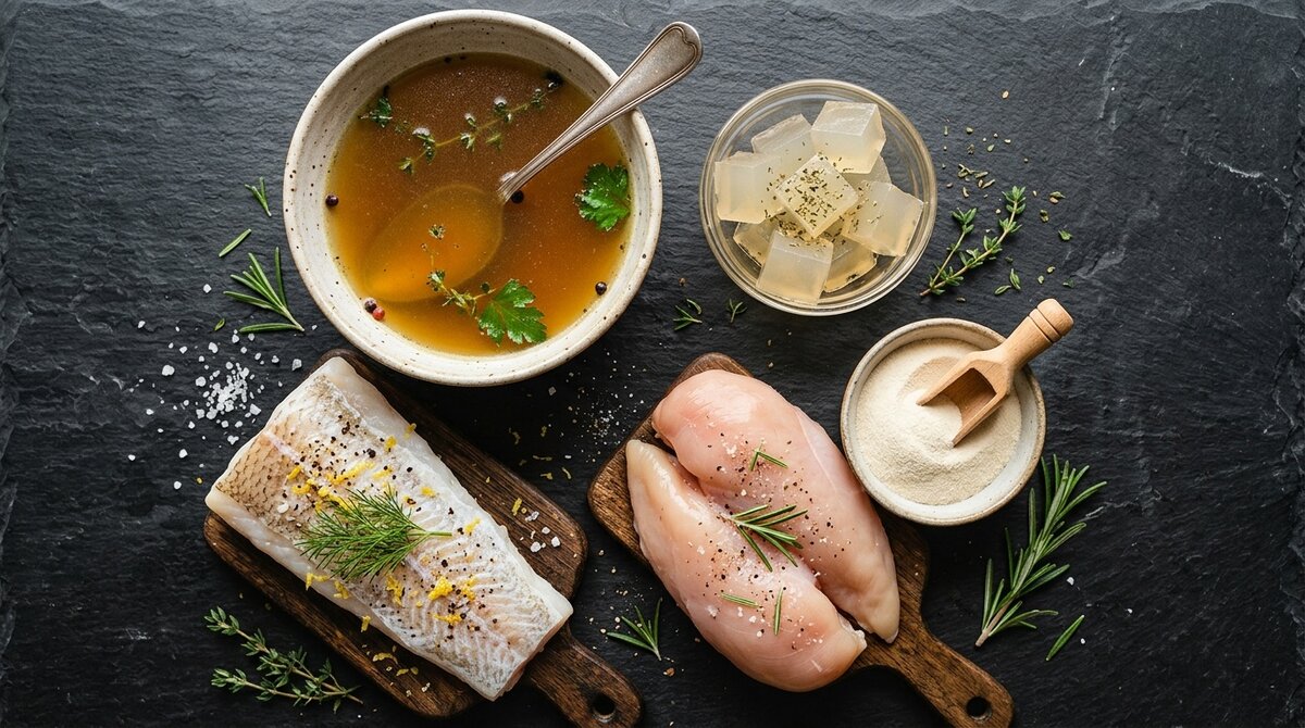- Bone broth: One of the best sources. Long cooking extracts collagen from bones, which is rich in glycine. One cup can contain 2 to 3g of glycine.